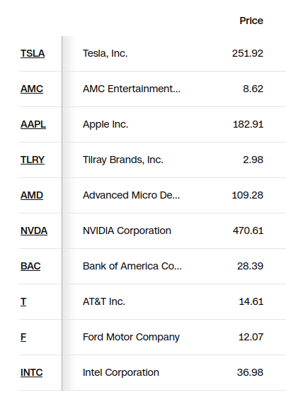Пример за закона на Бенфорд, показан на графиката по-долу, са текущите цени на десет „горещи акции“, измерени в щатски долари. Забележете, че водещите цифри на цените не са равномерно разпределени. Всъщност от десетте цени на акциите повечето имат малка начална цифра, а четири от тях (182.91, 109.28, 14.61 и 12.07) имат водеща цифра 1…