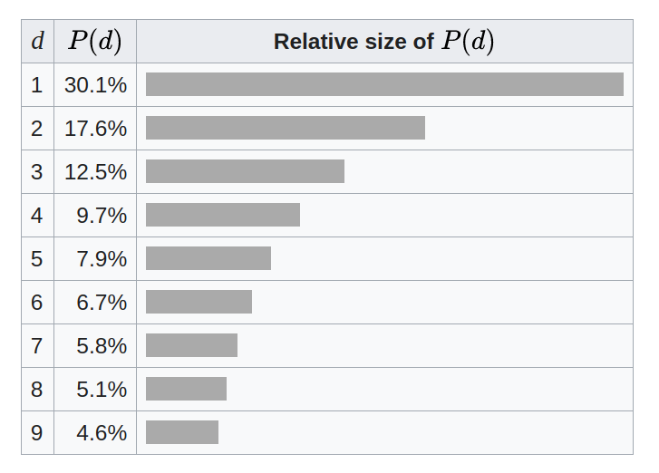 Законът на Бенфорд е наблюдението, че в много набори от цифрови данни от реалния живот водещата цифра вероятно е малка и е равна на 1 в около 30% от времето.