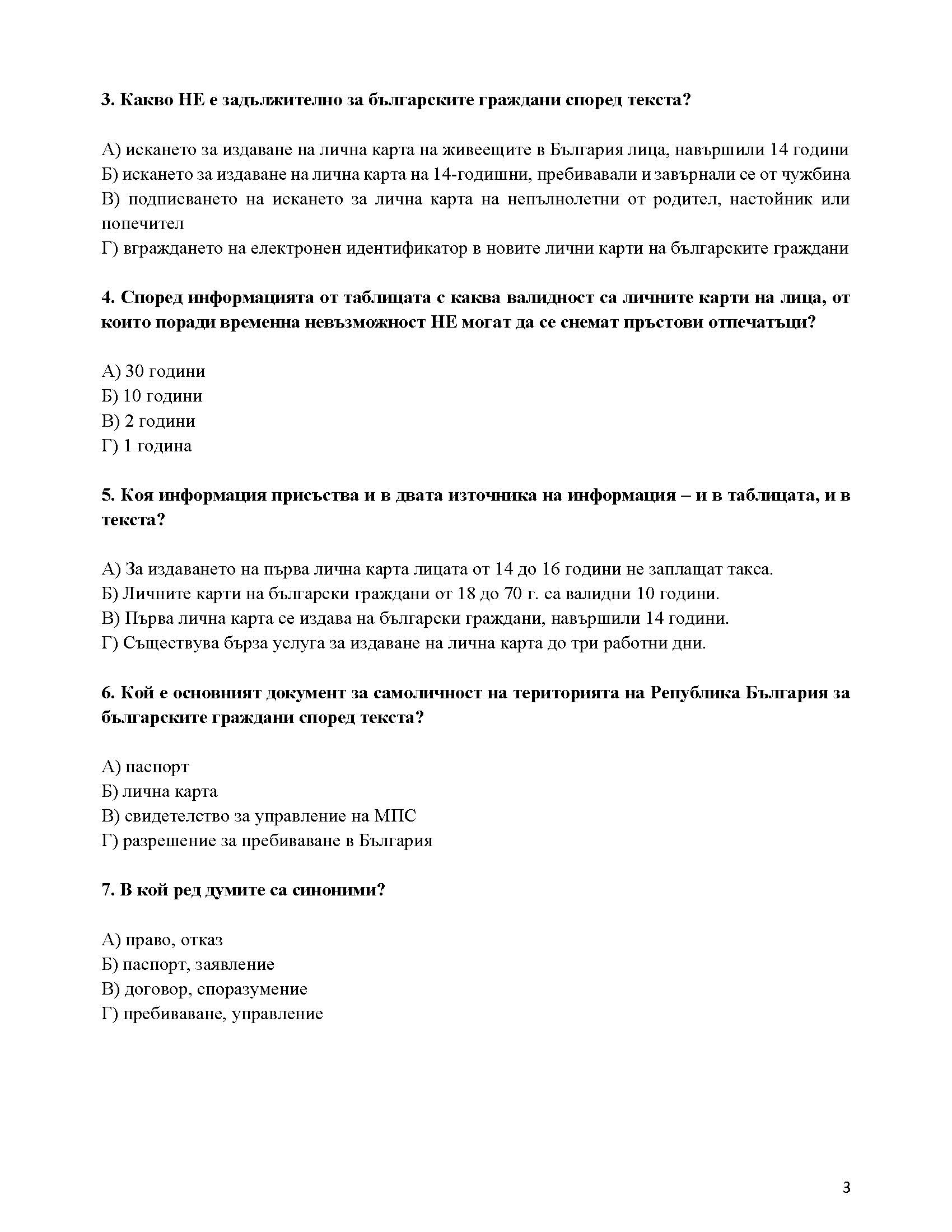 - 18 задачи с избираем отговор: Учениците трябва да изберат правилния отговор от няколко предложени варианта.