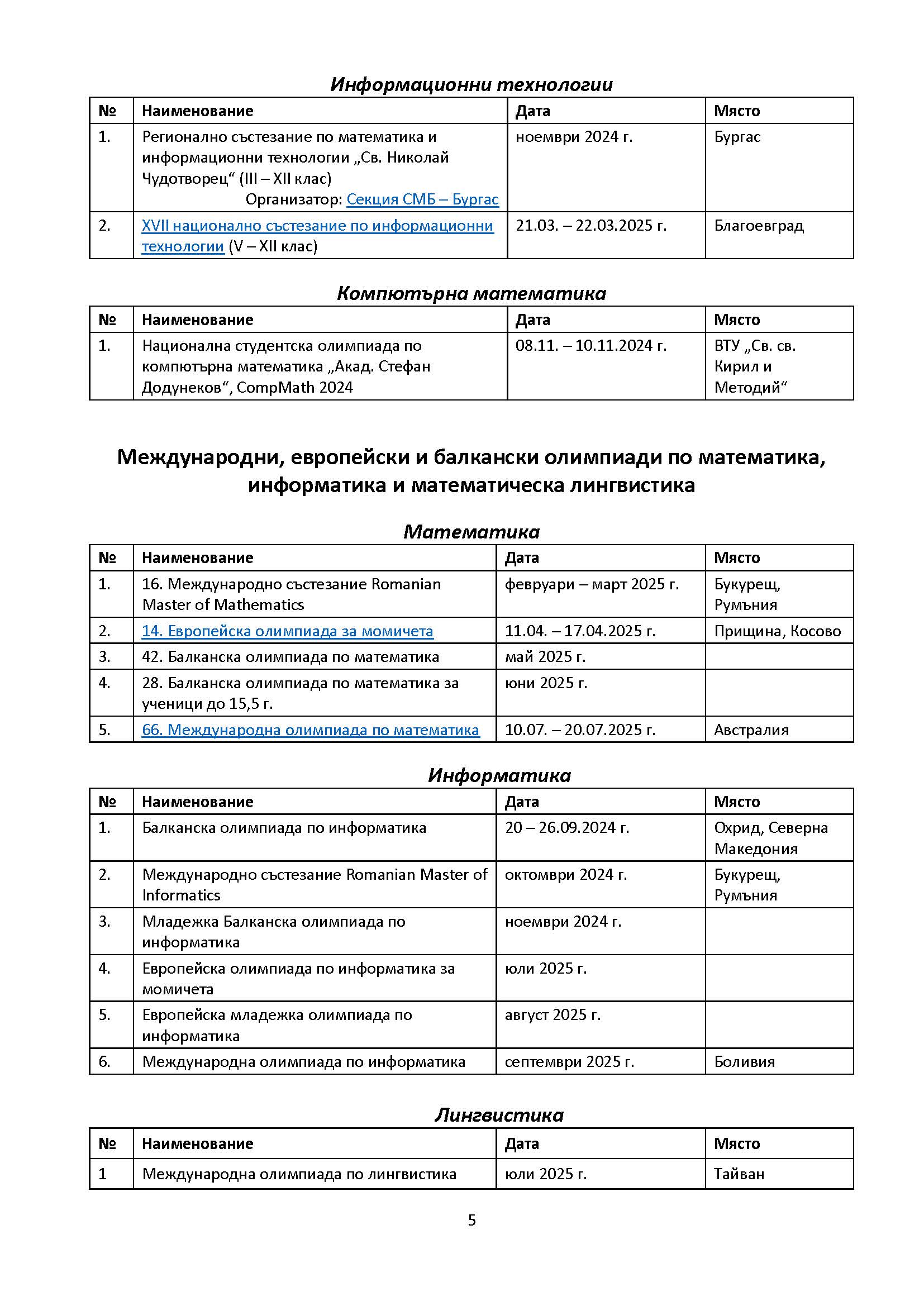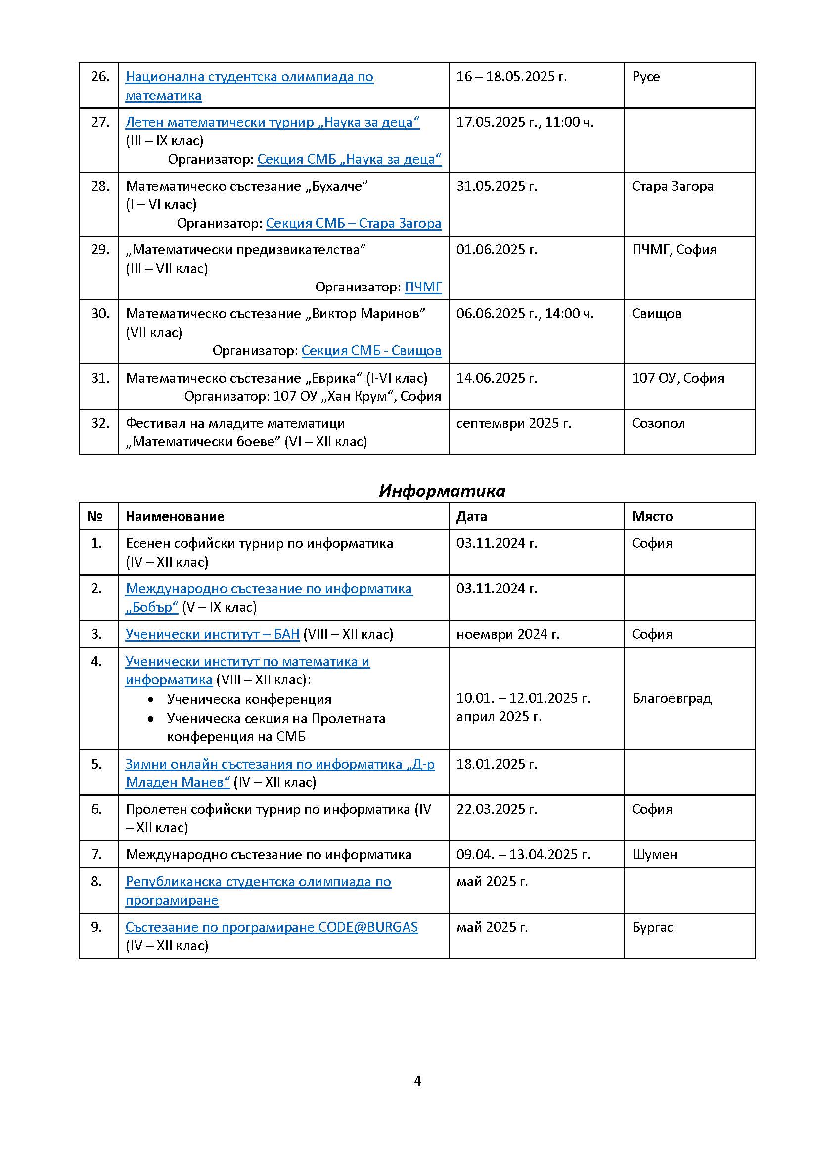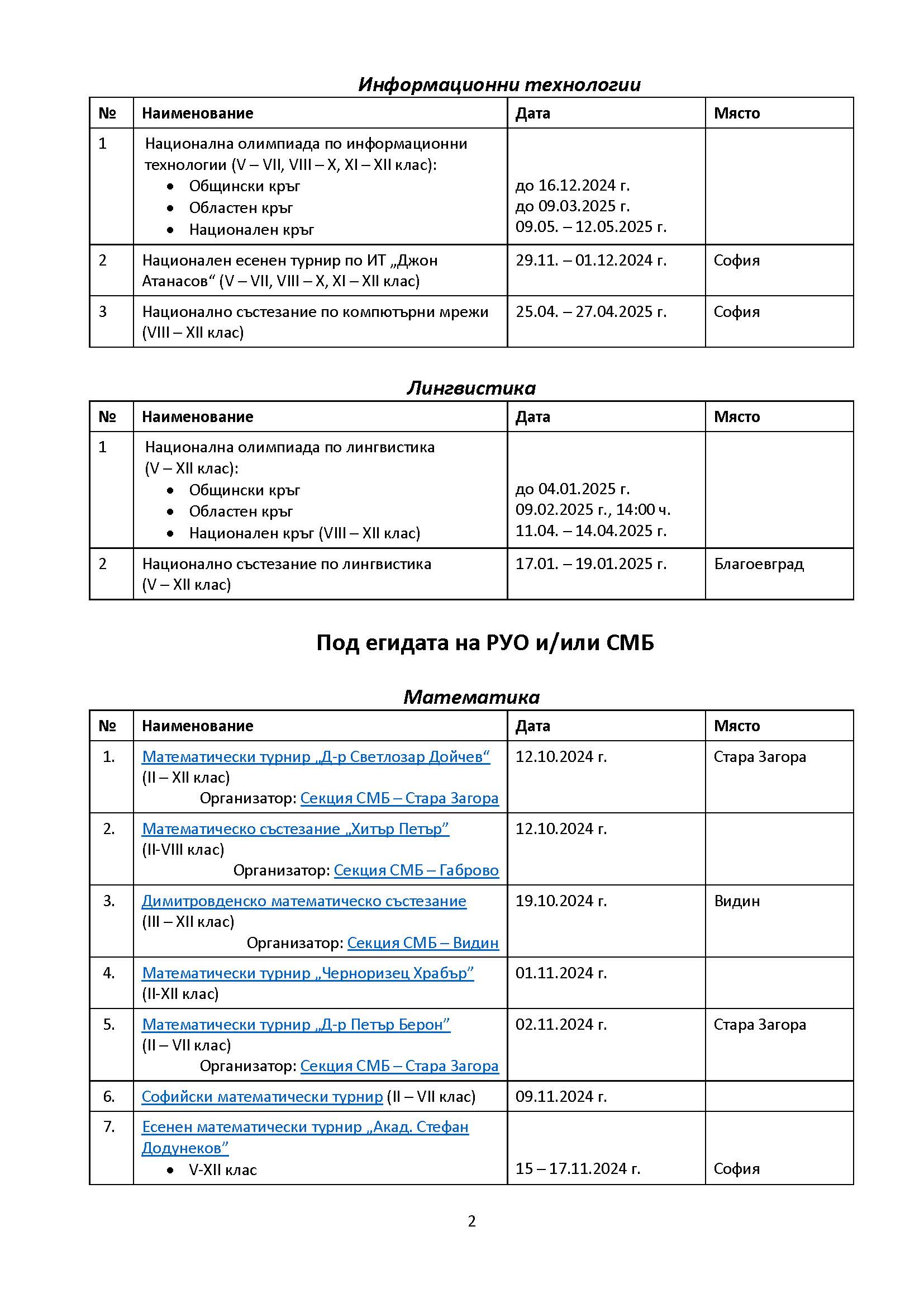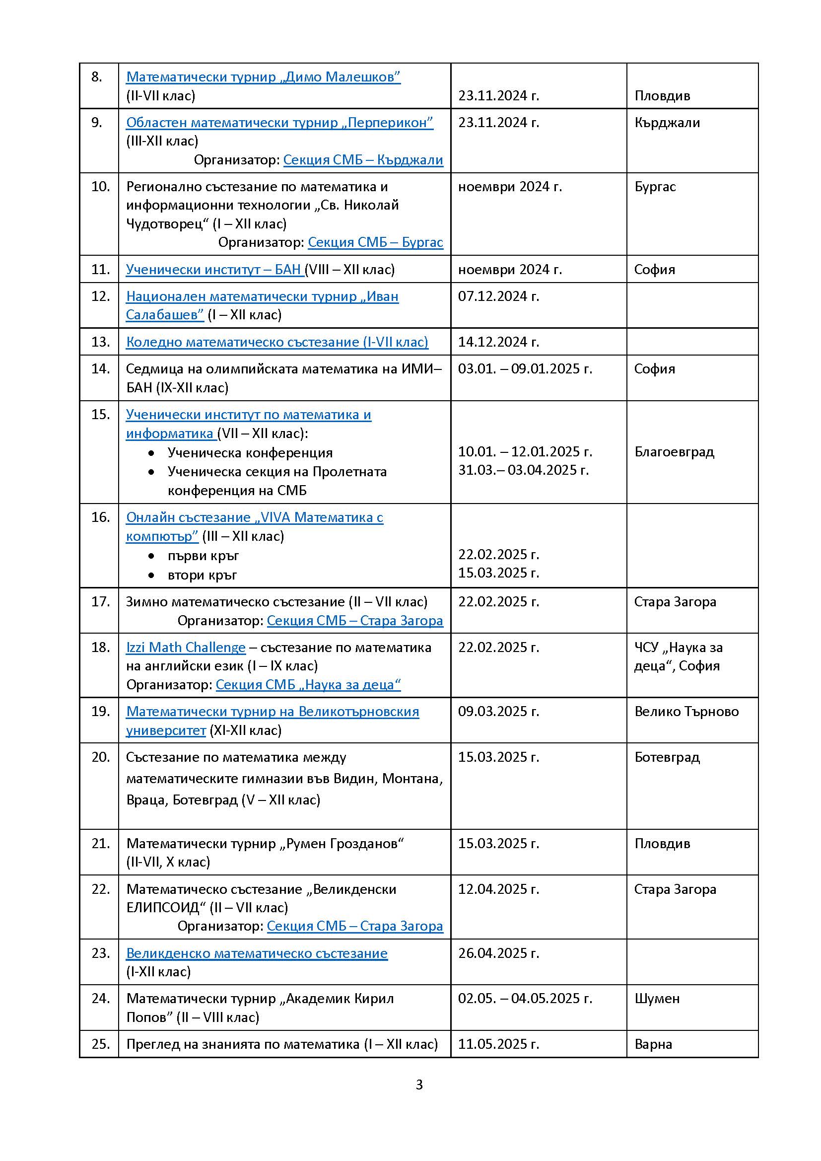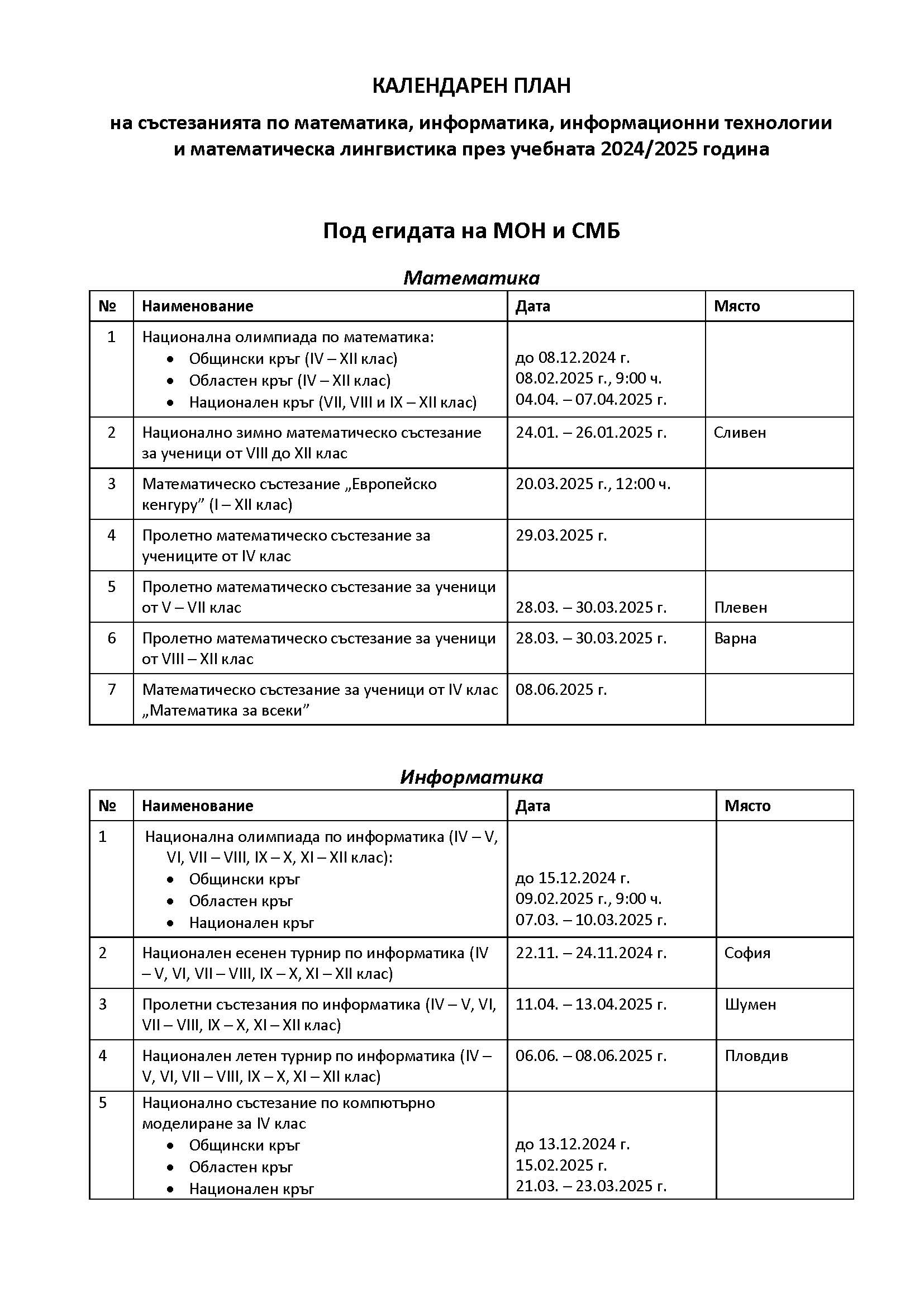 Календар – математически турнири 2024/2025 според програмата на МОН и СМБ: