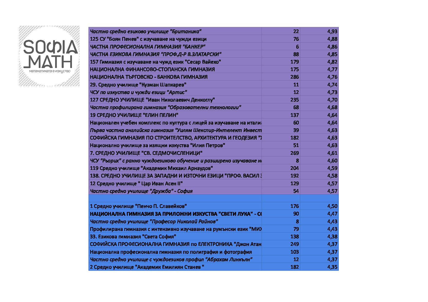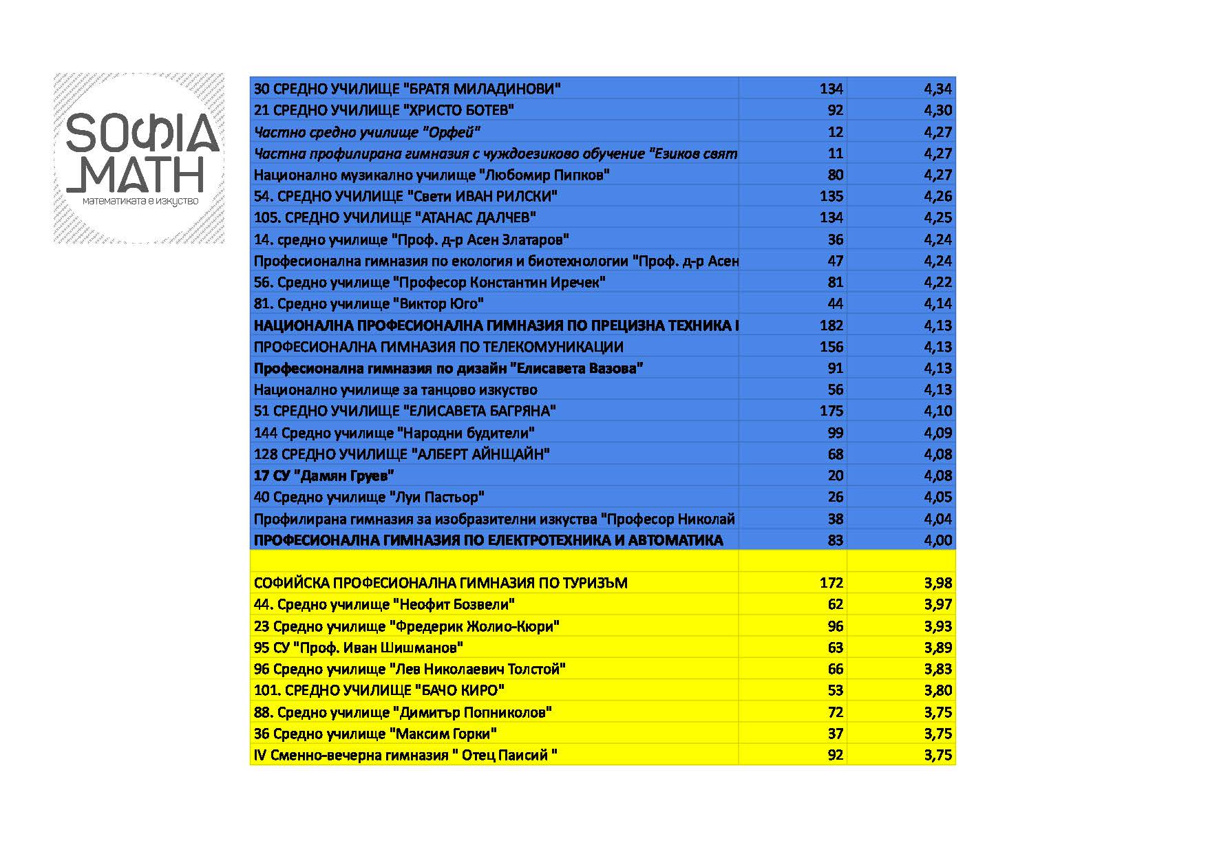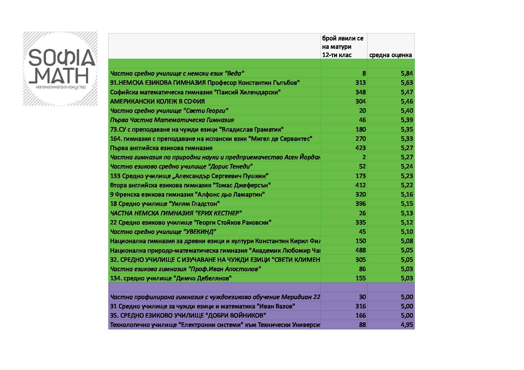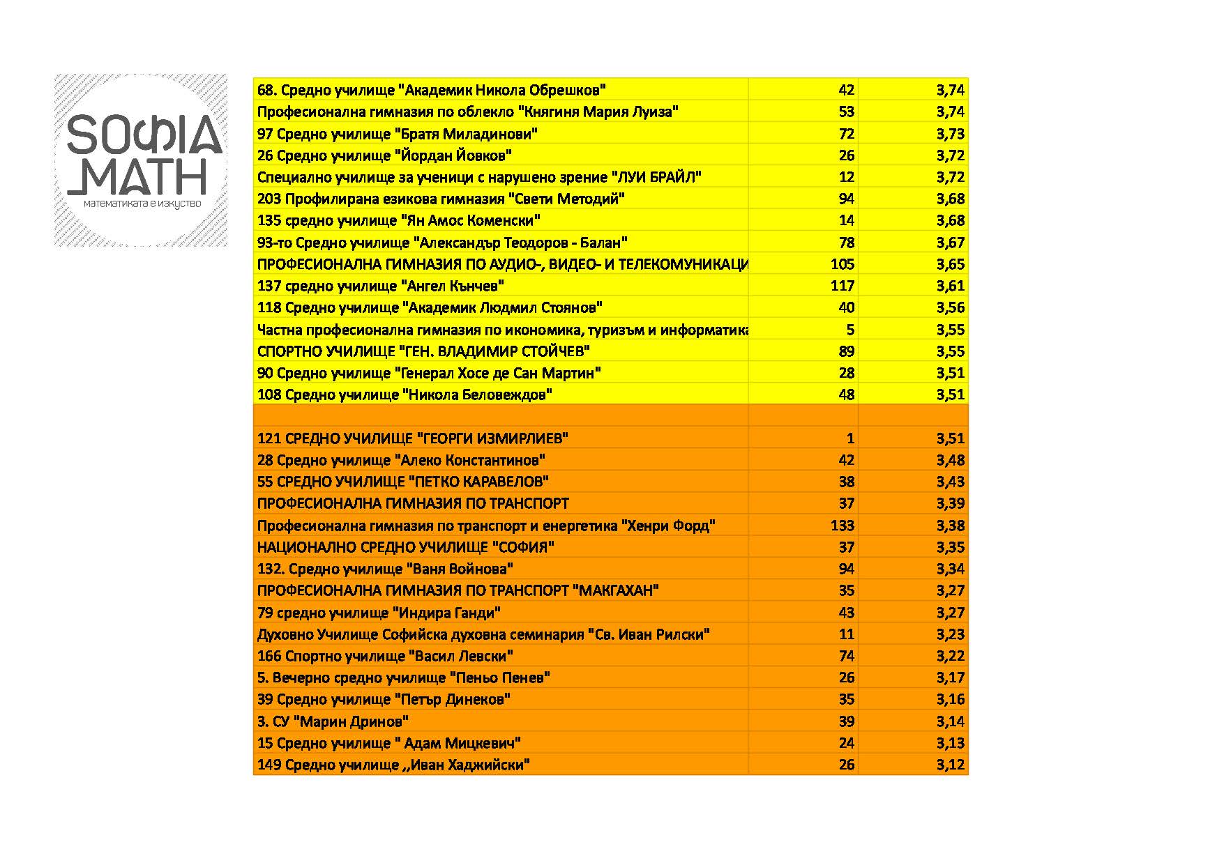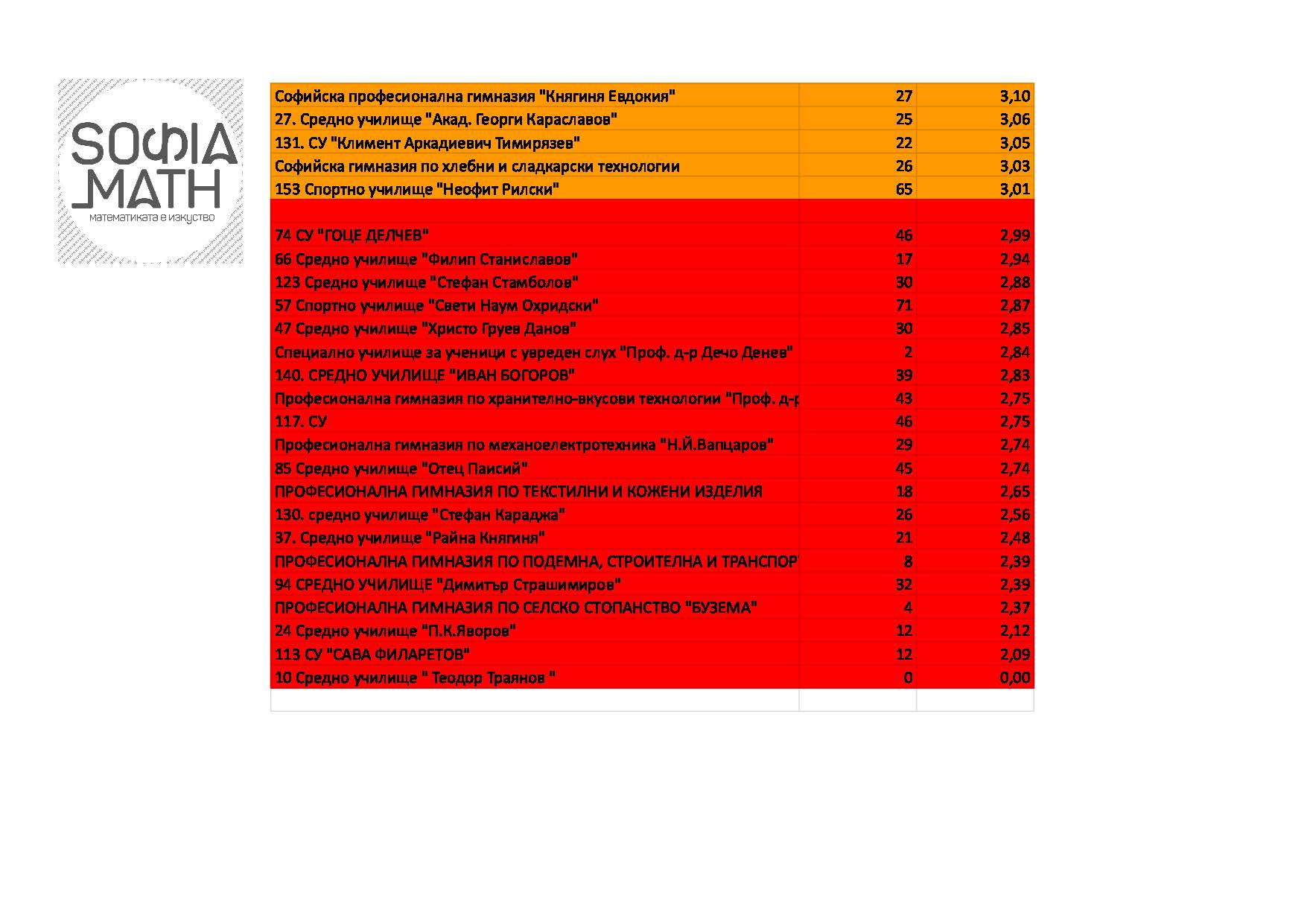 Подредбата показва ясно най-добрите и най-лошите училища. Изводите оставяме на вас, с една бележка: имайте предвид, че резултатите там, където са се явили по-малко от 25 ученика могат силно да варират: така много частни училища с малко ученици са напред, но това не е гаранция за добри общи резултати. Нямаме данни за неявилите се ученици. (Ако на всички неявили можем да пишем ‘2’, резултатите вероятно щяха да са различни.)