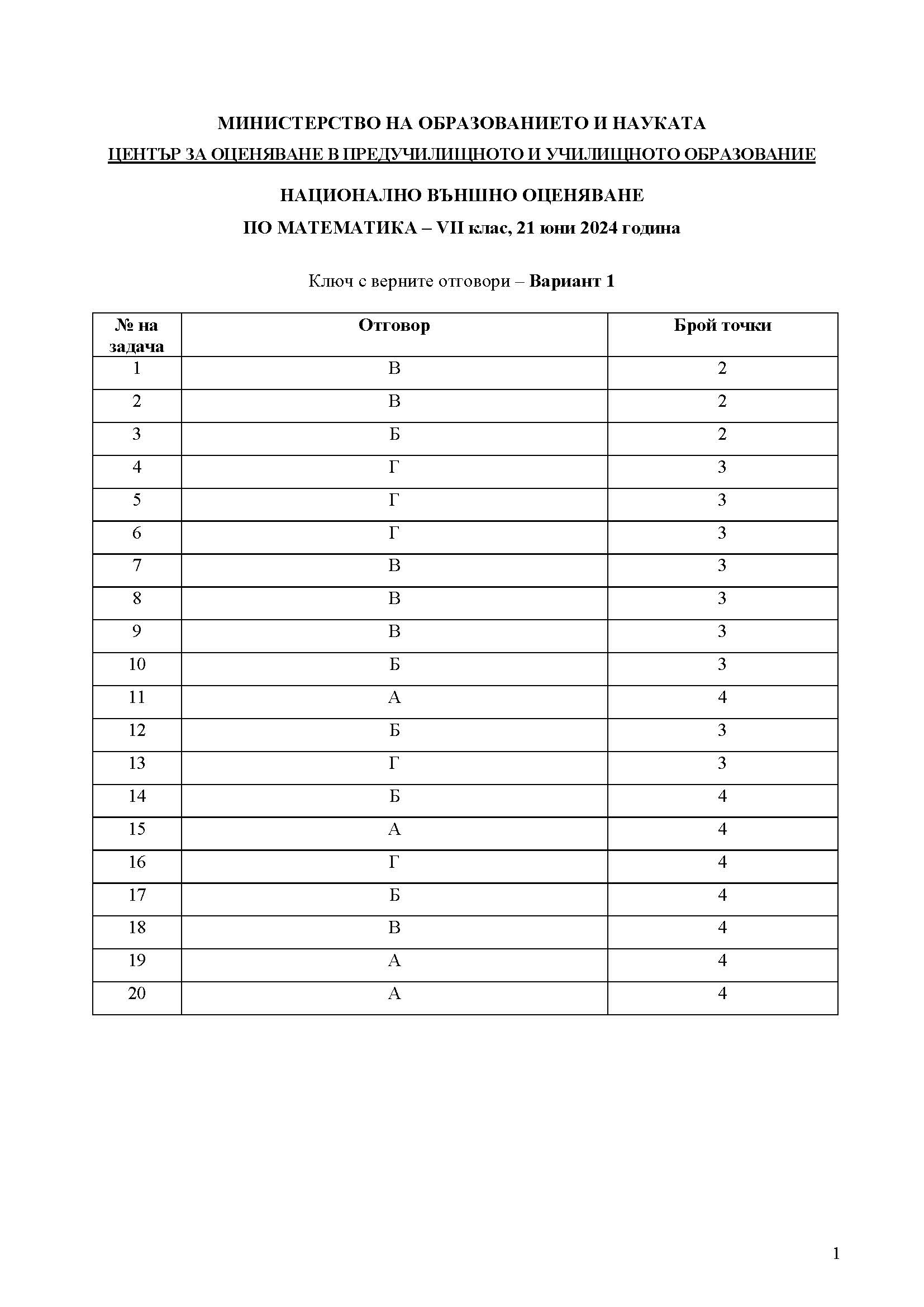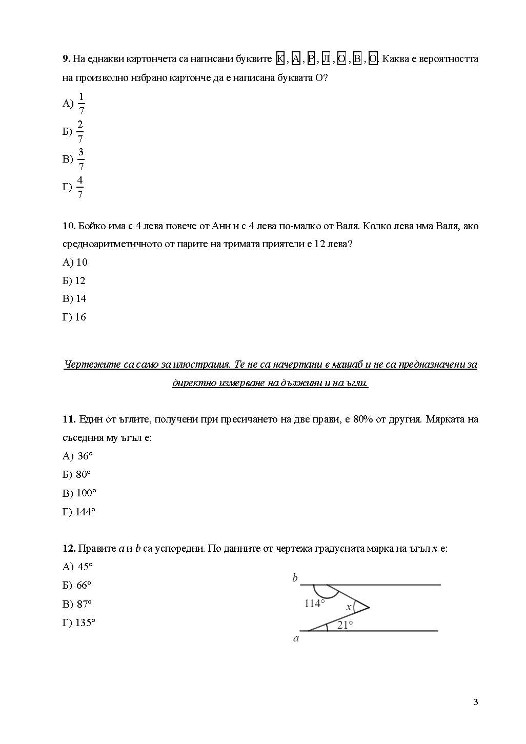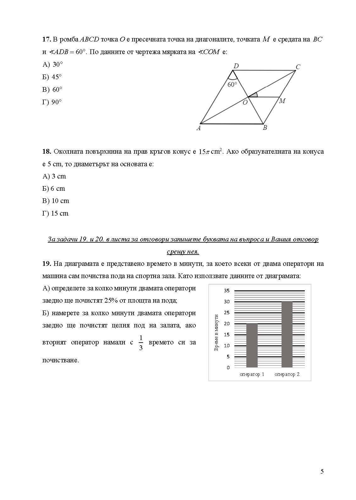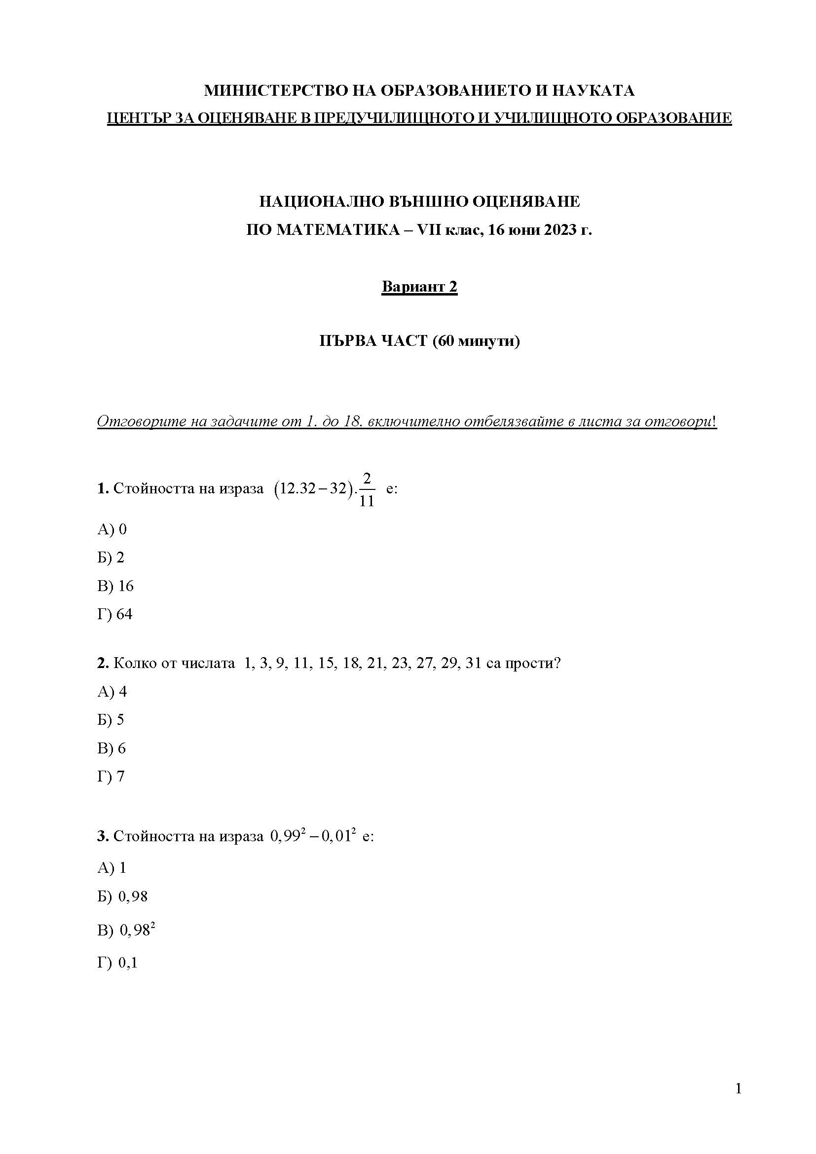 През първата част, за 1 час и 15 минути, учениците отговарят на 20 въпроса с избор от 4 отговора (за общо 65 точки). Тук е нужно да се работи за време, за оптимално решение, бързи, но точни сметки и точни знания на материала от 6-ти и 7-ми клас и методите за решаването му.