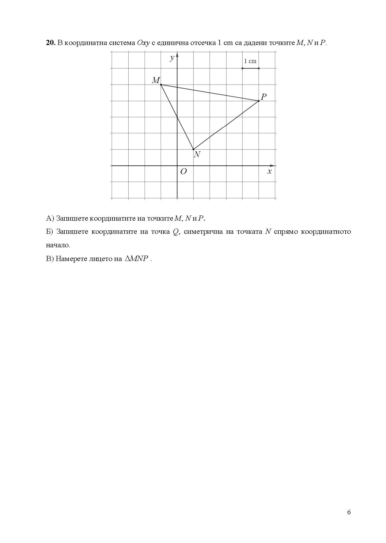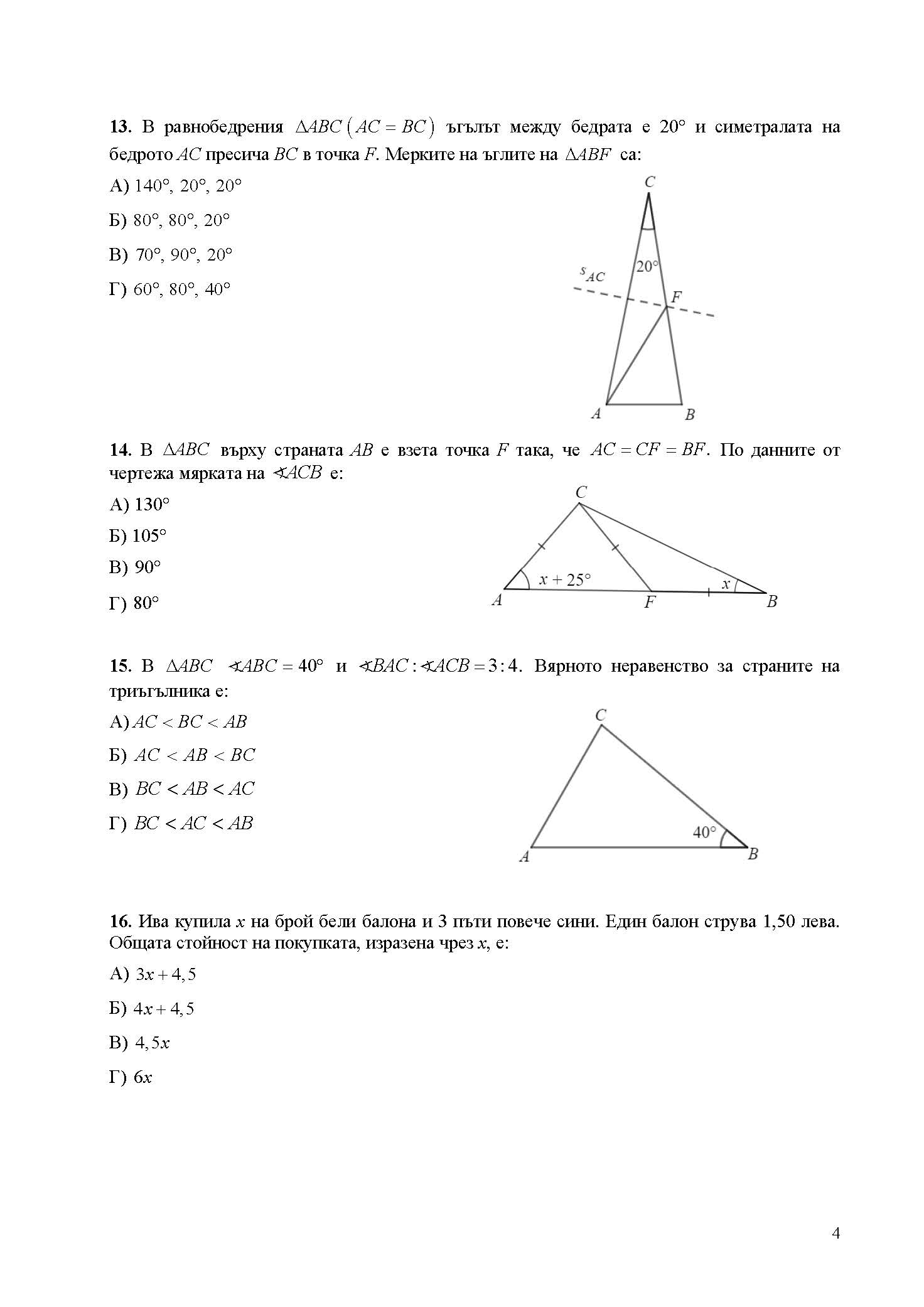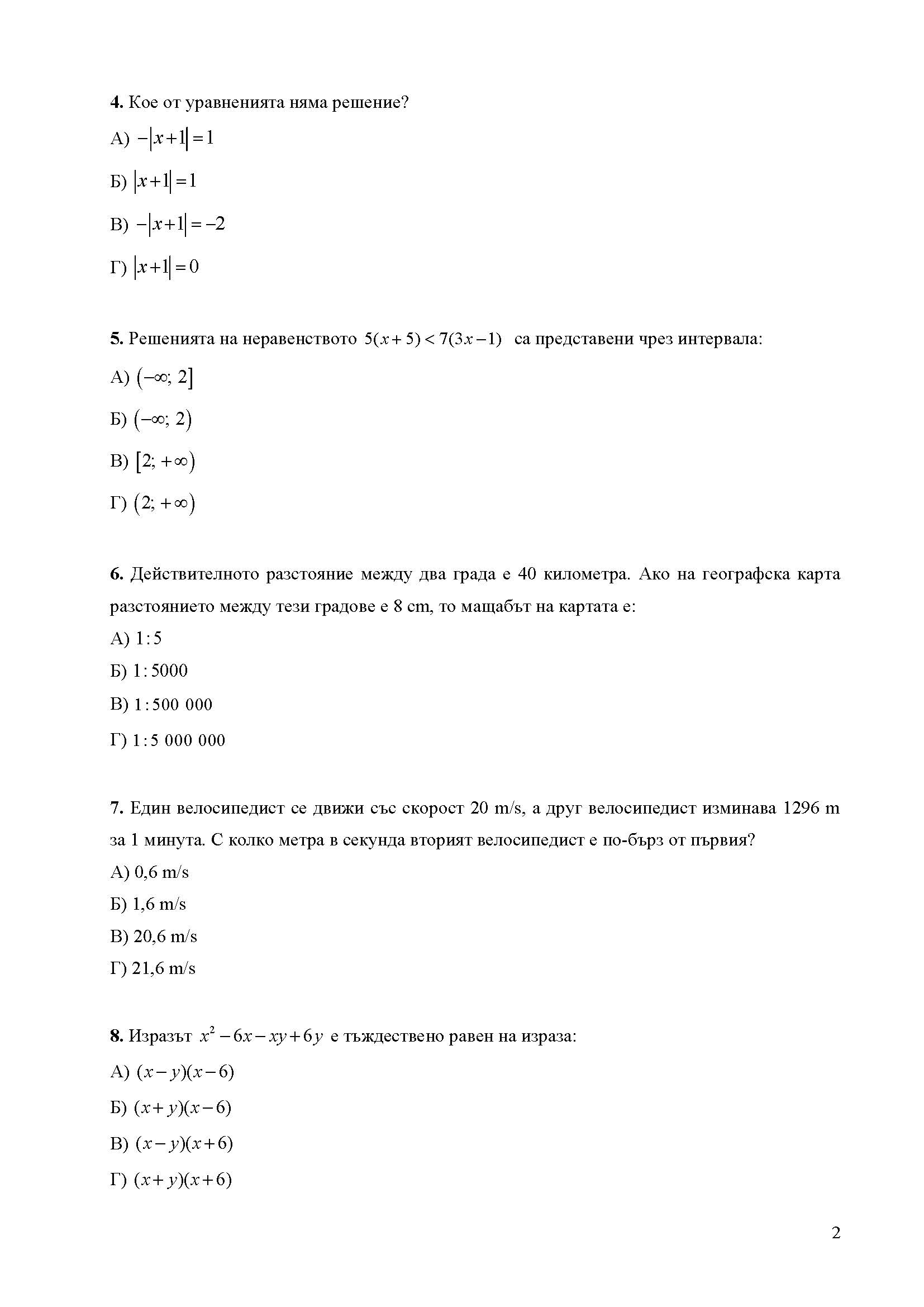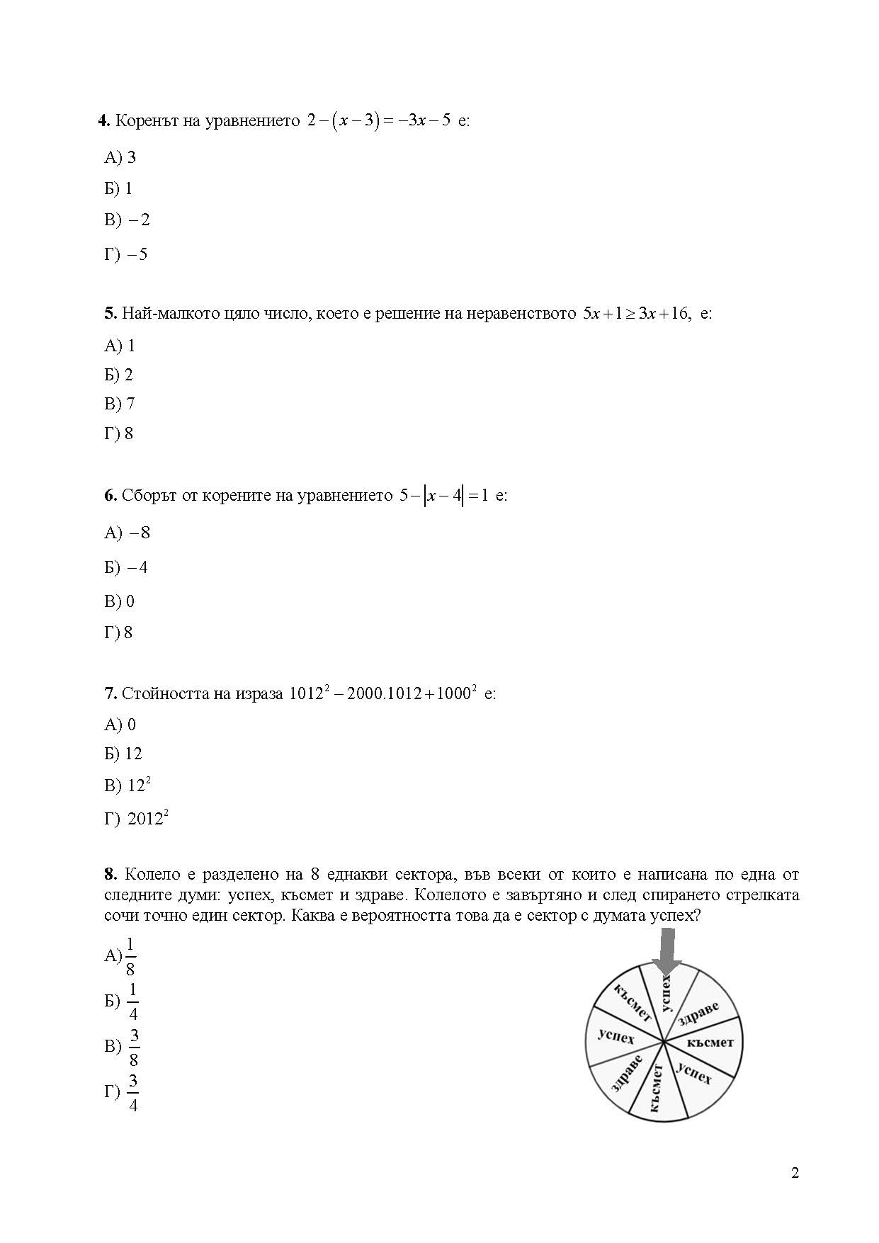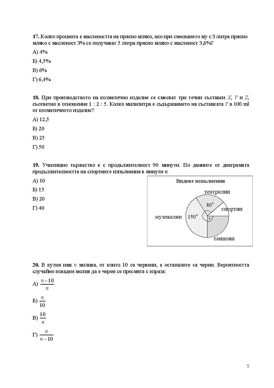 През първата част, за 1 час и 15 минути, учениците отговарят на 20 въпроса с избор от 4 отговора (за общо 65 точки). Тук е нужно да се работи за време, за оптимално решение, бързи, но точни сметки и точни знания на материала от 6-ти и 7-ми клас и методите за решаването му.