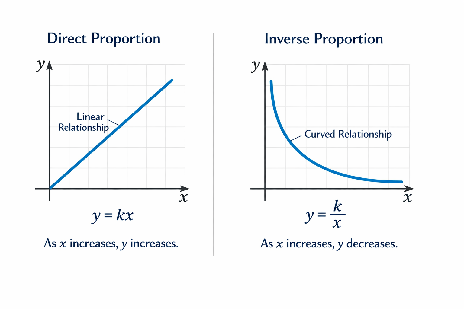 Коефициент ($k$): Това е постоянно число ($k \neq 0$). То показва произведението на двете променливи. Ако знаеш една двойка стойности $(x, y)$, винаги можеш да намериш $k$, като ги умножиш.